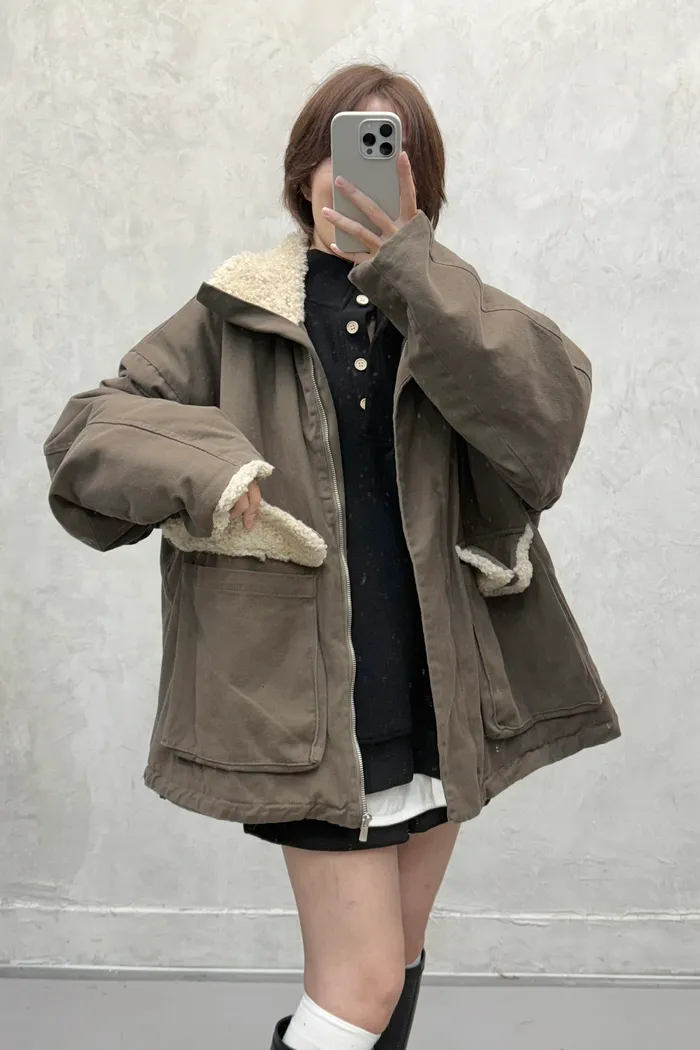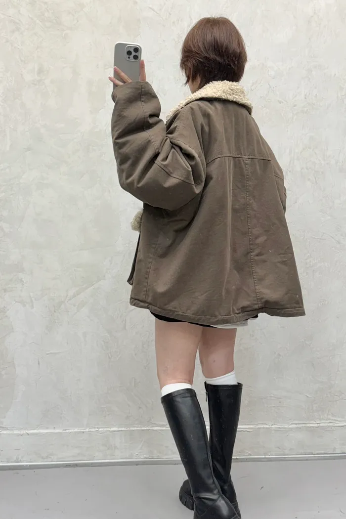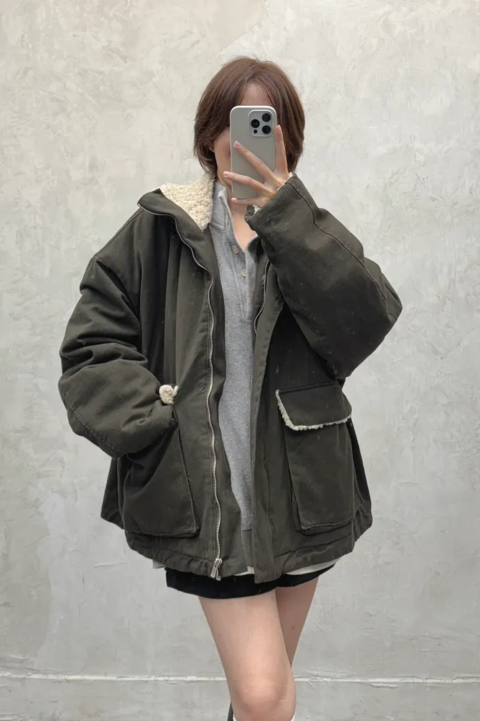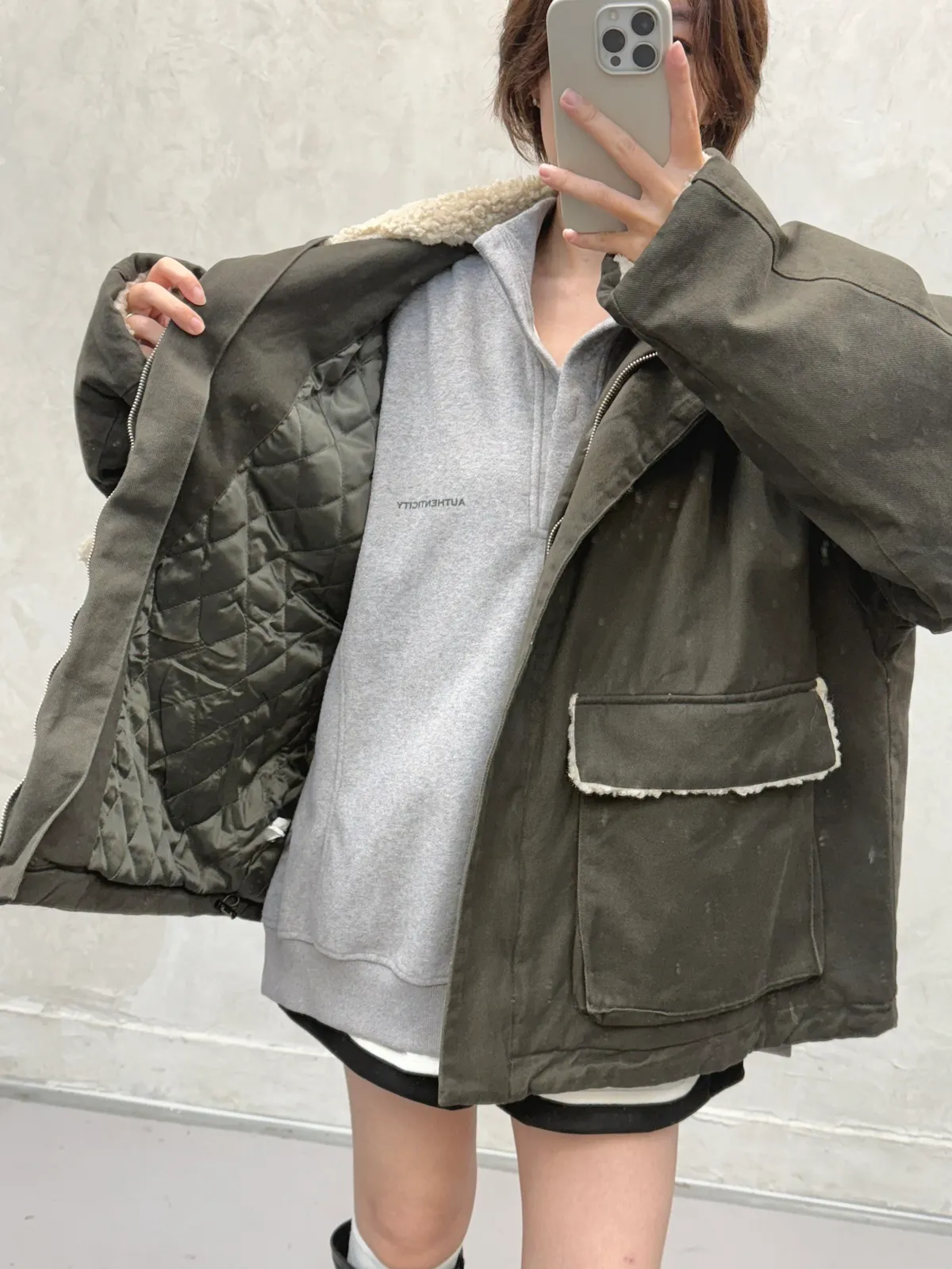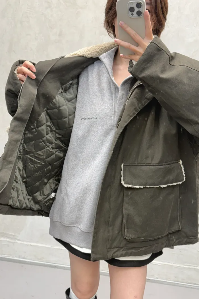 #3014 羊羔毛拼接鋪棉外套【現貨:灰綠】