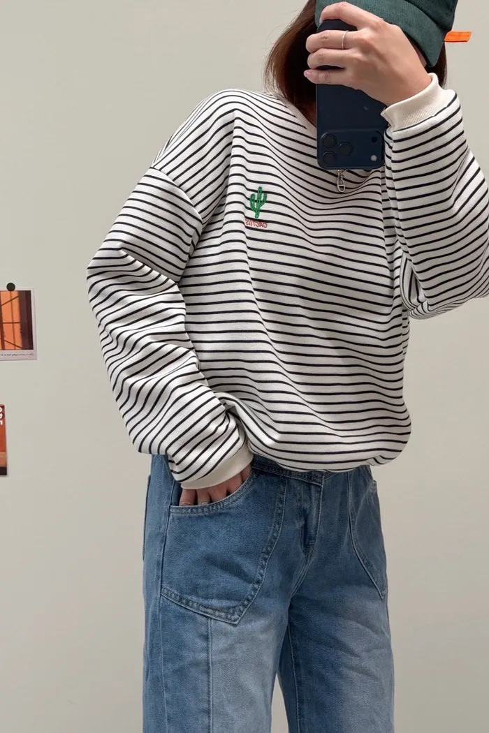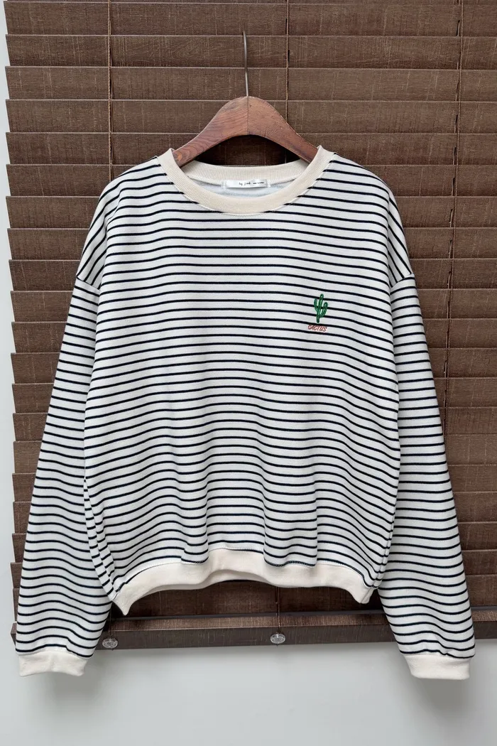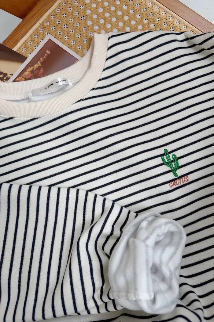 #3202 電繡仙人掌刷毛條紋大學Tee