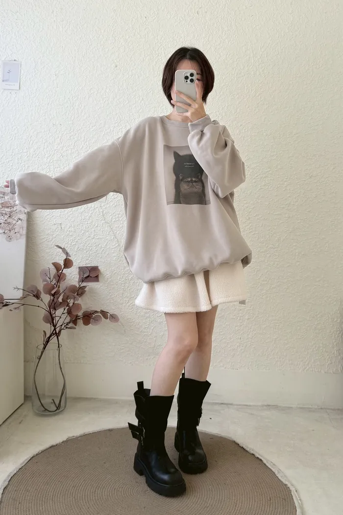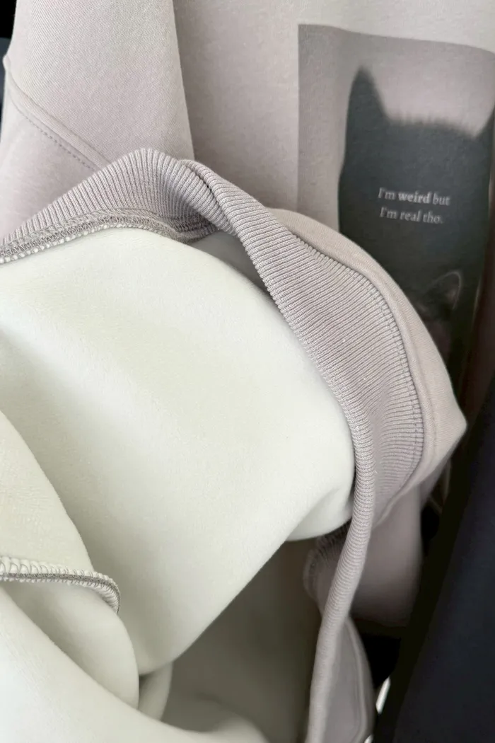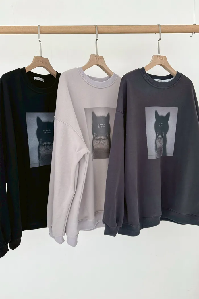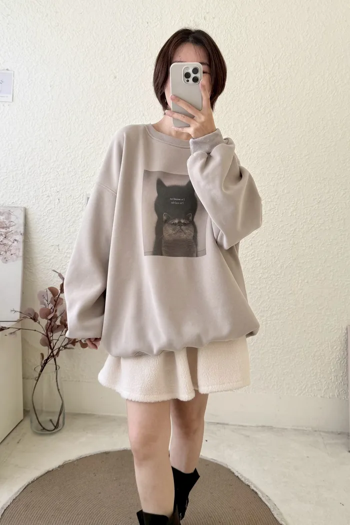 【現貨】#4102 男女共穿.瞪眼貓貓刷絨大學Tee